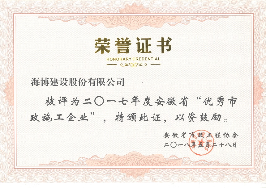 近日,安徽省市政工程協(xié)會(huì)發(fā)布了市政協(xié)會(huì)秘字【2018】06號(hào)文件,文件中表彰了2017年度“安徽省優(yōu)秀市政施工企業(yè)”和“安徽省市政施工企業(yè)優(yōu)秀建造師(項(xiàng)目經(jīng)理)”。經(jīng)過省市政工程協(xié)會(huì)專家評(píng)審委員會(huì)的層層評(píng)比...