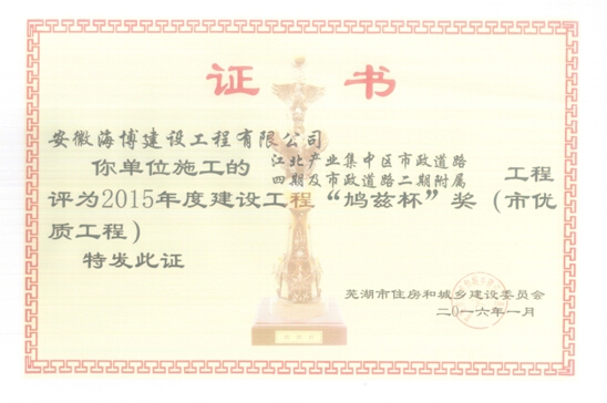 2016年2月2日,蕪湖市建筑業(yè)協(xié)會于市住建委大樓召開建筑業(yè)協(xié)會常務(wù)理事會暨工作交流會;會上,蕪湖市建委向榮獲2015年“鳩茲杯”獎的單位頒發(fā)了獲獎證書及獎杯,我單位承建的“江北產(chǎn)業(yè)集中區(qū)市政道路四...