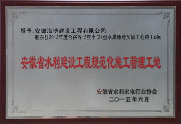 我公司承建的“肥東縣2013年度合裕等15座省級小(二)型水庫除險加固工程6標”獲得 2014年度“安徽省水利建設(shè)工程規(guī)范化管理工地”的榮譽稱號。 該工程為省級?。?)型水庫除險加固項...