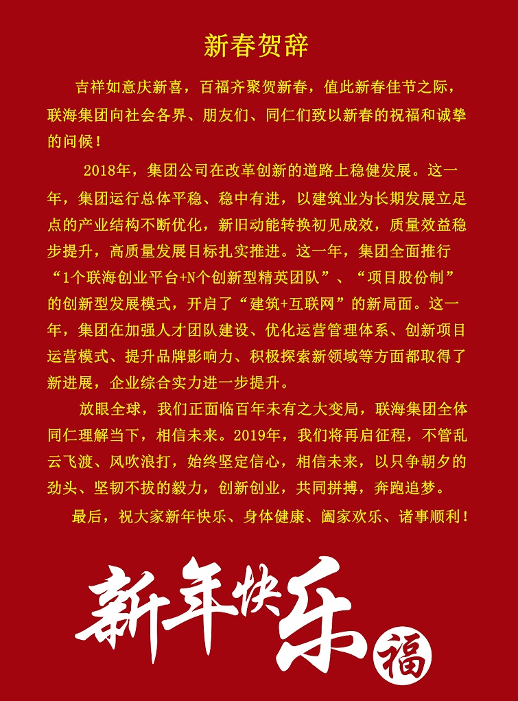 ------聯(lián)海集團2019年喜迎新春會 2019年1月12日注定是一個喜慶的日子、一個振奮人心的日子、一個對未來充滿期待的日子;聯(lián)海集團全體同仁共聚翡翠湖·迎賓館,大家歡聚一堂、凝心聚力、總結(jié)過去、理解當...