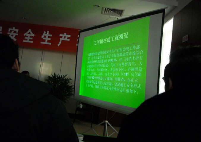 黨組書記張永安同志首先就肥西縣建設(shè)局發(fā)布的 “建設(shè)[2009]151號,建設(shè)[2009]154號,建設(shè)[2009]155號”文件中的工作進(jìn)行安排。接著解軍培同志講述了“百日會戰(zhàn)”開展情況,并就安全檢查中存在的隱患以幻燈片的形式展示給參會企業(yè),讓企業(yè)領(lǐng)導(dǎo)體會在建項目安全隱患的嚴(yán)重性以及安全隱患處理的緊迫性。李紹敏同志就施工報建、安全生產(chǎn)、農(nóng)民工工資等問題提出存在的問題及整改要求,重點對施工用電、臨邊防護(hù)、腳手架搭設(shè)及地面硬化、施工機具現(xiàn)場防護(hù)及現(xiàn)場施工人員的安全意識等方面存在的問題進(jìn)行批評和教育,要求企業(yè)領(lǐng)導(dǎo)一定要在安全生產(chǎn)過程中起帶頭作用,深入項目施工現(xiàn)場,親自把關(guān),把整改措施落實到位。