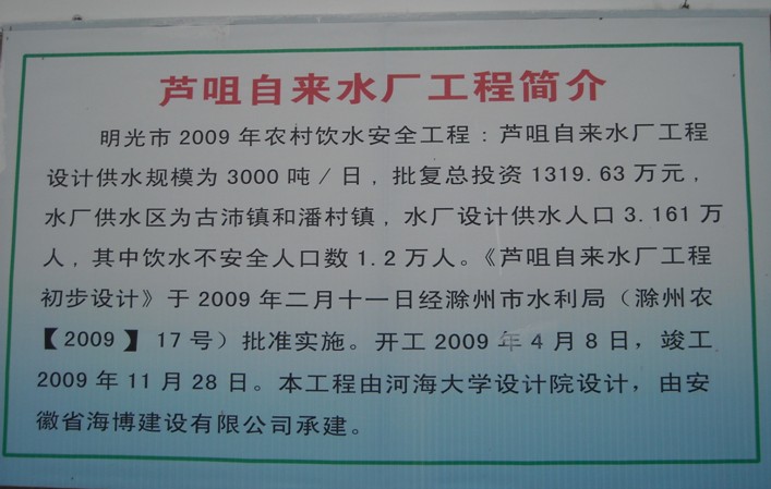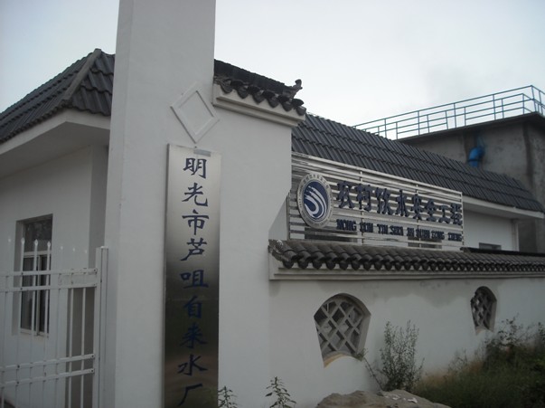 明光市蘆咀自來水廠工程是明光市2009年農(nóng)村飲水安全項目的一部分,我公司克服地理位置偏僻、資金短缺、施工難度大等許多困難,精心組織施工力量,積極協(xié)調(diào)施工環(huán)境,安全生產(chǎn),文明施工,最終按進度保質(zhì)保量圓滿完成了施工任務。