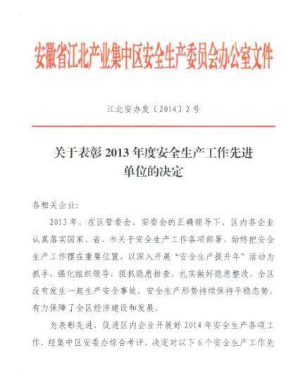 4月2日,安徽省江北產(chǎn)業(yè)集中區(qū)召開2014年第一次安全生產(chǎn)會議,我公司市政道路四期項目部在安全生產(chǎn)工作中表現(xiàn)突出,被集中區(qū)管委會、安委會授予“2013年度安全生產(chǎn)工作先進單位”榮譽稱號。