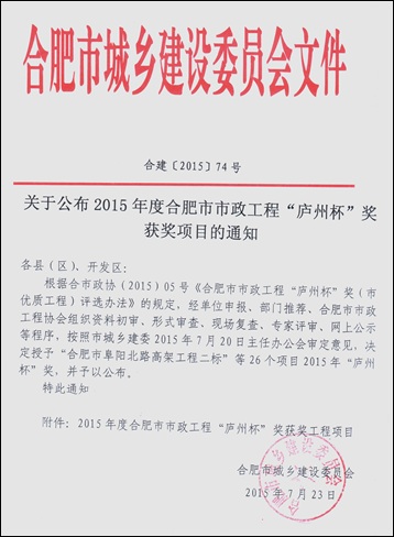 炎炎夏日,驕陽似火,我公司喜獲2015年度合肥市市政工程“廬州杯”獎(jiǎng),給酷熱的盛夏送來了陣陣涼意。由公司承建的合肥市高新區(qū)寧西路(長(zhǎng)寧大道-肥西界)道橋及附屬工程經(jīng)合肥市城鄉(xiāng)建設(shè)委員會(huì)及合肥市市政工程協(xié)會(huì)審定,順利獲得此次獎(jiǎng)項(xiàng)。