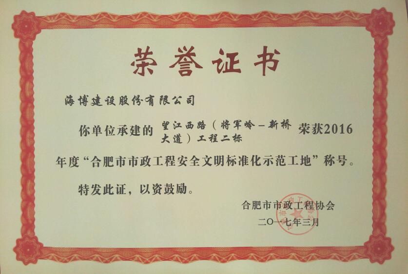 望江西路(將軍嶺路-新橋大道)建設(shè)工程二標是空港產(chǎn)業(yè)新城與主城區(qū)重要通道,該工程積極開展安全生產(chǎn)文明施工標準化管理成效顯著,近日榮獲合肥市2016年度“市政工程安全文明標準化示范工地”。同時,該工程受到合肥市公路管理局的高度評價,已經(jīng)通過“平安工地”的評審。