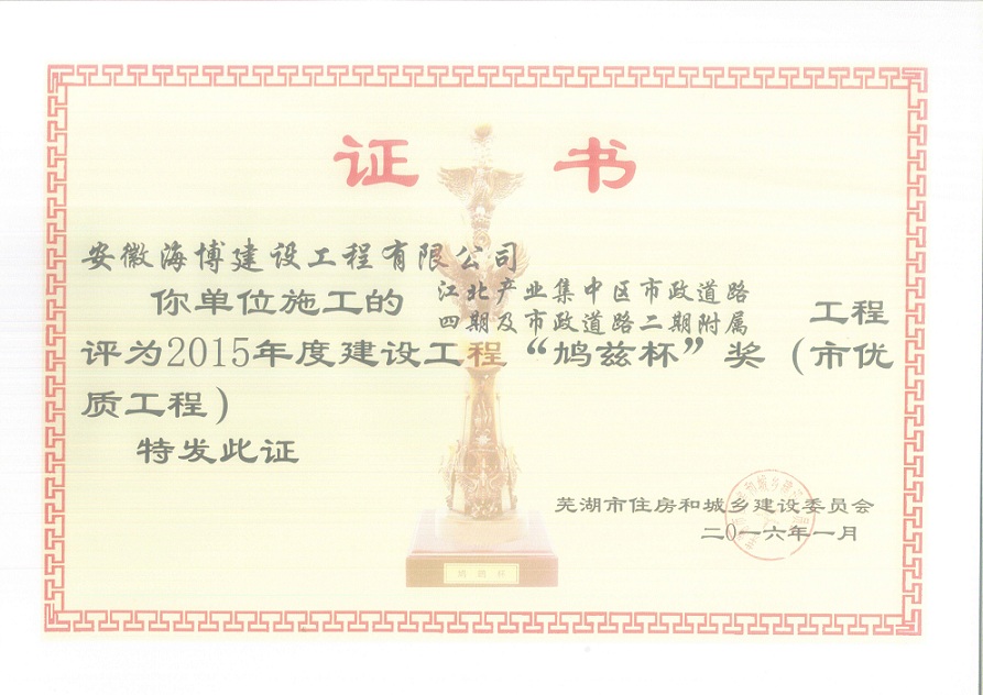 近期,我公司承建的江北產(chǎn)業(yè)集中區(qū)市政道路四期及市政道路二期附屬皖江大道明渠工程,喜獲2015-2016年度安徽省建設(shè)工程“黃山杯”榮譽(yù)。該工程位于蕪湖市鳩江區(qū)江北產(chǎn)業(yè)集中區(qū)起步區(qū)內(nèi),路線全長約9.4km,呈“井”字形布局,路面寬度24~32m,設(shè)計(jì)車速40km/h,新建瀝青混凝土路面,工程總造價(jià)約1.47億元。2014年3月,榮獲江北產(chǎn)業(yè)集中區(qū)“安全生產(chǎn)工作先進(jìn)單位”稱號(hào)。2016年1月,獲得2015年度蕪湖市建設(shè)工程“鳩茲杯”獎(jiǎng),全面實(shí)現(xiàn)了工程質(zhì)量目標(biāo)。