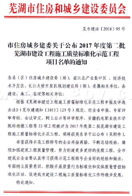 2017月12月15日,由蕪湖市、無為縣建設工程質量監(jiān)督站及相應專家組成的評審組,按照《蕪湖市建設工程施工質量標準化示范工程申報及評選辦法》(蕪市建通知[2015]129號),對該工程申報蕪湖市建設工程施工質量標準化示范工程進行現場復審。