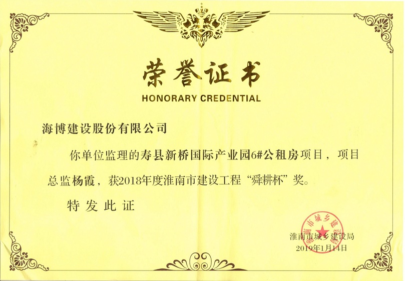 日前,淮南市城鄉(xiāng)建設(shè)局公布了2018年度淮南市建設(shè)工程優(yōu)質(zhì)工程獎(jiǎng)名單,我司承擔(dān)監(jiān)理的壽縣國際產(chǎn)業(yè)園6#公租房項(xiàng)目喜獲2018年度淮南市建設(shè)工程“舜耕杯”獎(jiǎng)。