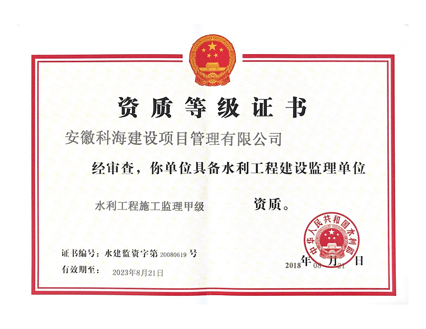 安徽科海建設(shè)項目管理有限公司現(xiàn)有國家級監(jiān)理資質(zhì)為:水利工程施工監(jiān)理甲級、房屋建筑工程監(jiān)理甲級、市政公用工程監(jiān)理甲級。