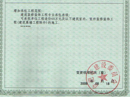 我公司新增裝飾裝修專業(yè)承包三級(jí)資質(zhì)獲得批準(zhǔn)