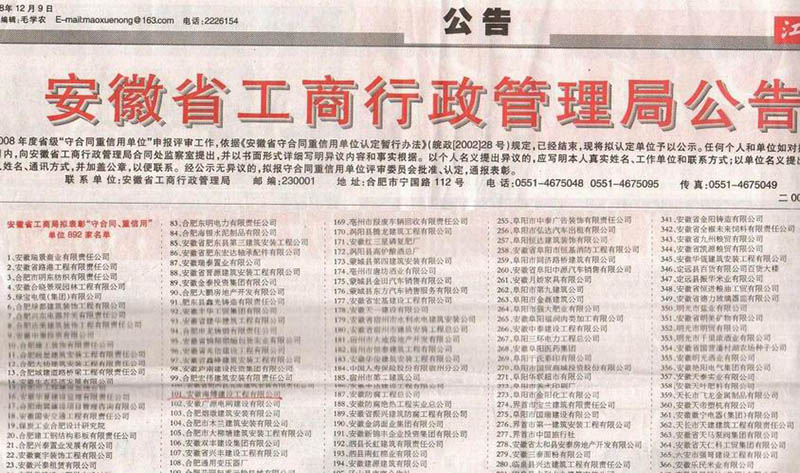 在2008年底由安徽省工商行政管理局舉辦的2007-2008年度“守合同、重信用”企業(yè)評(píng)選中,我公司在企業(yè)成立時(shí)間短、參選單位數(shù)量多等不利情況下,憑著管理層在企業(yè)成立至今一直貫徹執(zhí)行的合同管理制度、樹(shù)立社會(huì)良好信用品牌理念的指引下,從諸多大中型企業(yè)中脫穎而出,一舉當(dāng)選。